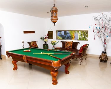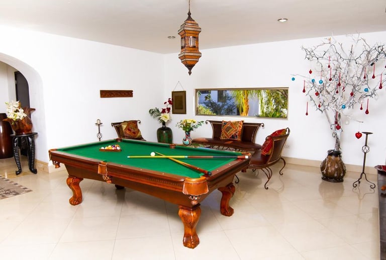 Diviértete en la sala de juegos con mesa de billar, el lugar perfecto para pasar un rato ameno con amigos y familiares. Además, relájate en la acogedora sala de estar, diseñada para convivir y disfrutar de momentos inolvidables en un ambiente cómodo y elegante.